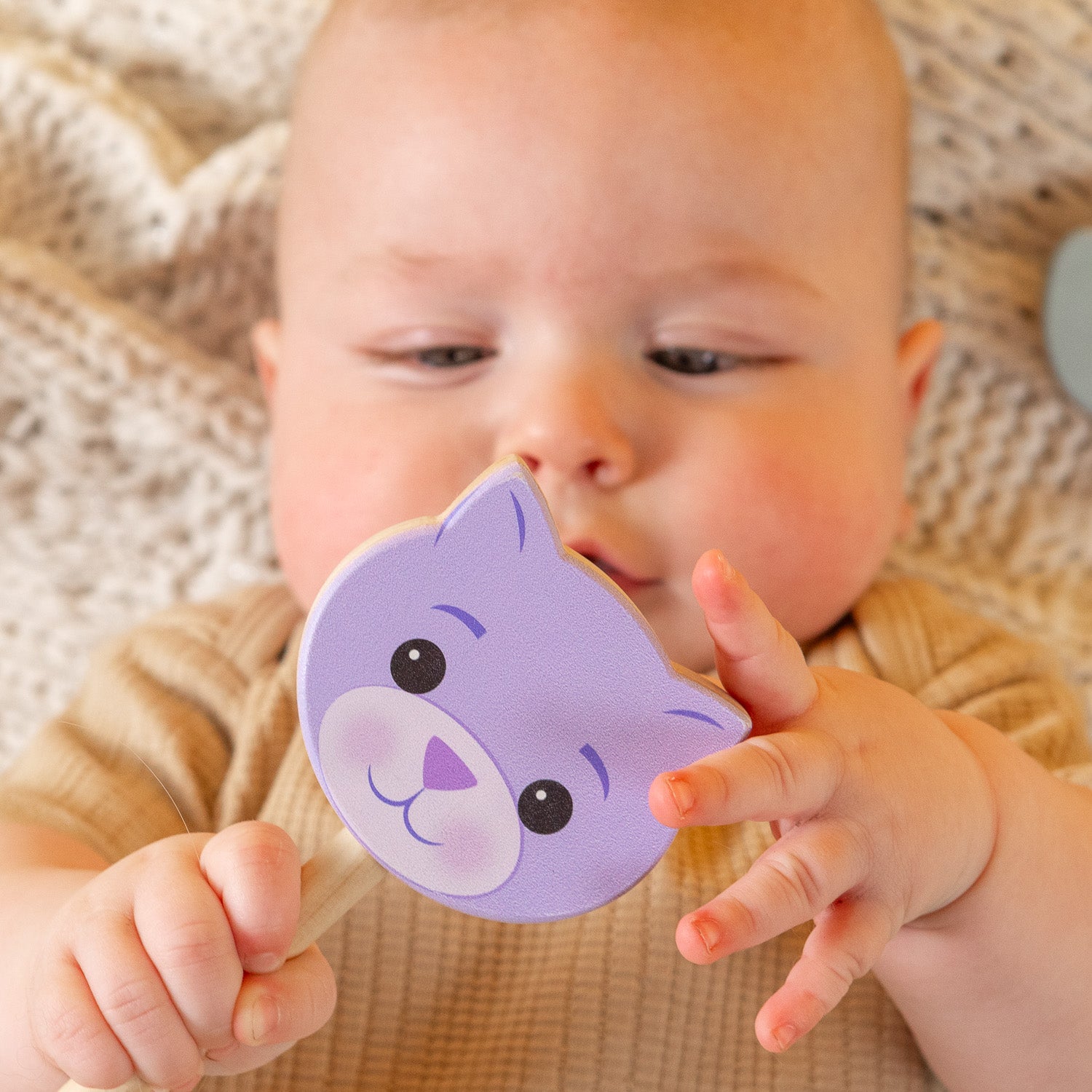 A baby holding a wooden cat rattle.